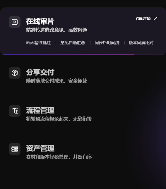分秒帧作为新一代云时代音视频生产协作SaaS,致力于帮助创作者在云端构建高效的工作流。它集成了在线审片、分享交付、流程管理、资产管理、远程监看等多项功能,为音视频创作者提供了一个全面、便捷的协作平台。