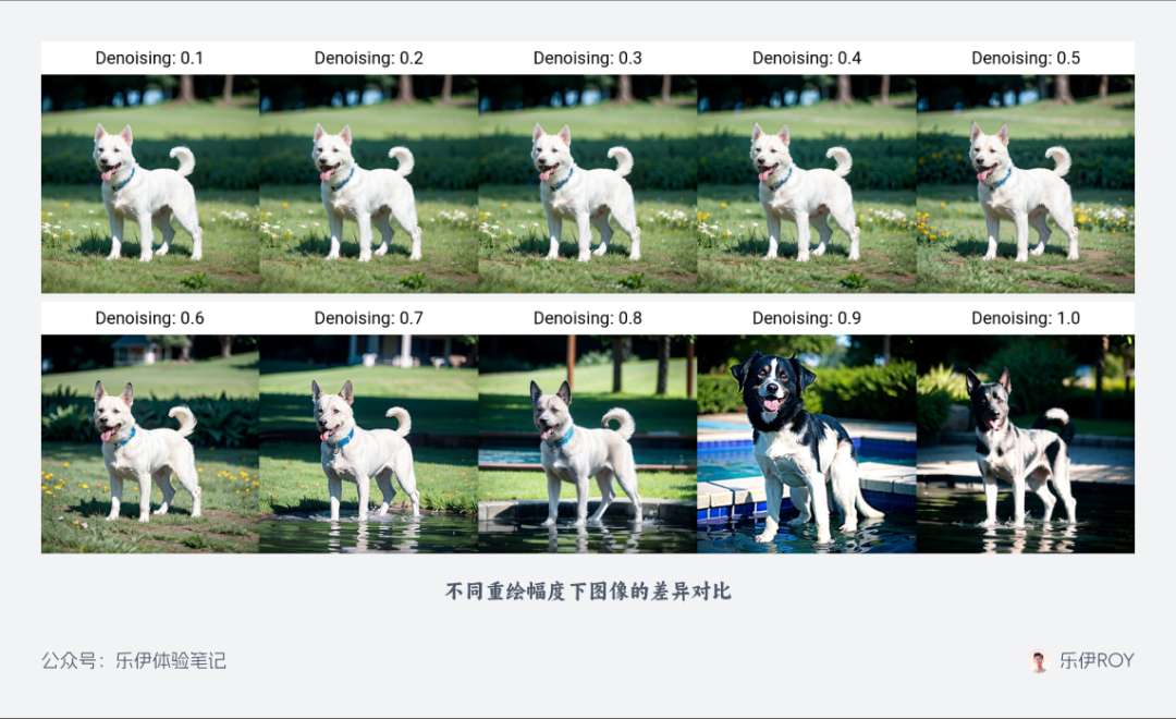 由于是在原图基础上进行重绘,所以我们可以通过重绘幅度参数来控制重绘后和原图的变化强度。通常建议将重绘幅度设置在 0.5 左右,如果想保证和原图尽可能接近,还可以适当降低参数数值。