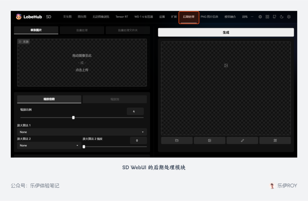除了以上方法,还有一个 SD WebUI 原生自带的图像高清化功能,叫【后期处理】模块。在顶部标签页找到并打开之后,我们会发现该模块支持设置的操作项并不多。