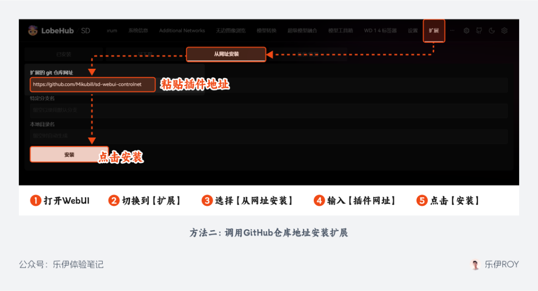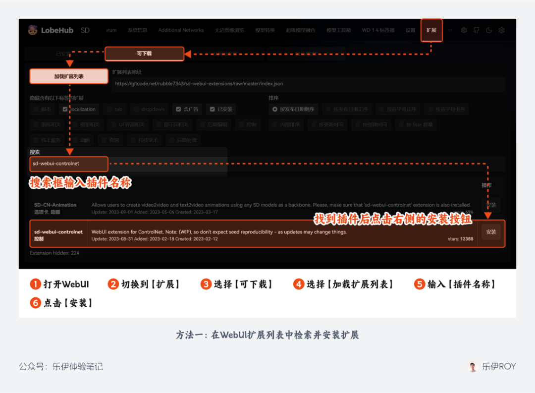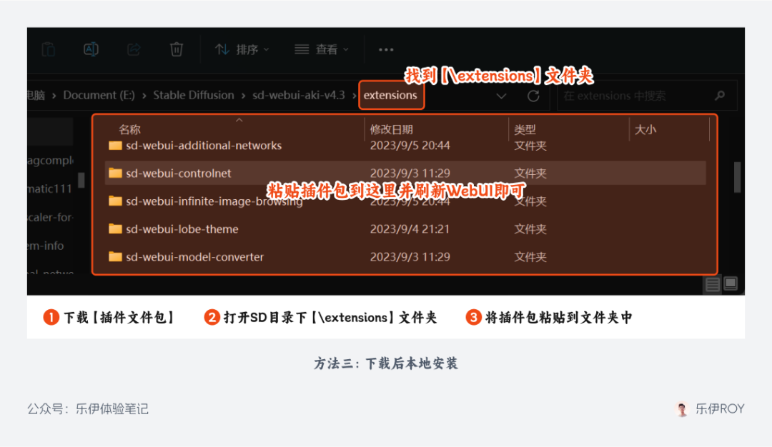 直接下载对应的扩展文件包,解压后放至 WebUI 根目录下的【extensions】文件夹,再重载 WebUI 界面即可正常使用。