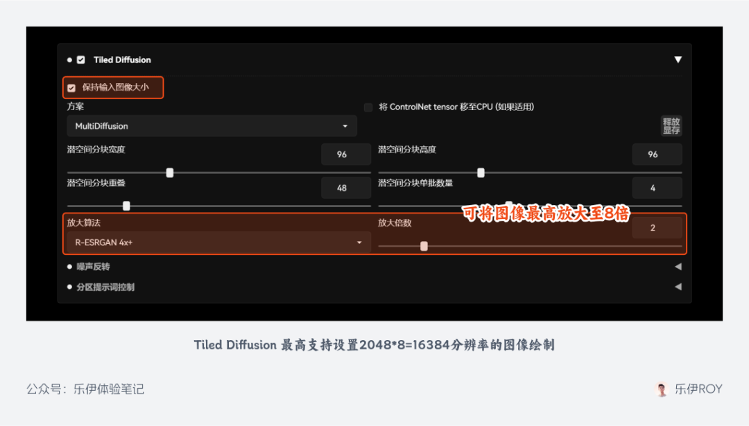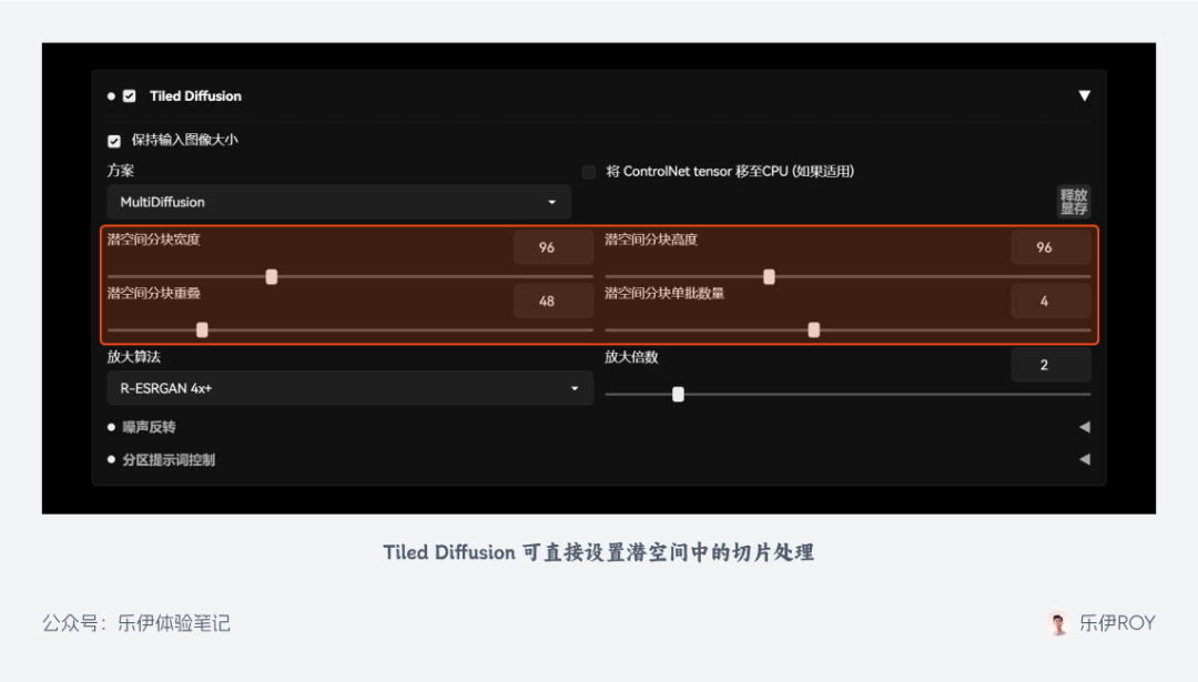 下面分别介绍下 2 个扩展的一些关键参数。首先是 Tile Diffusion: