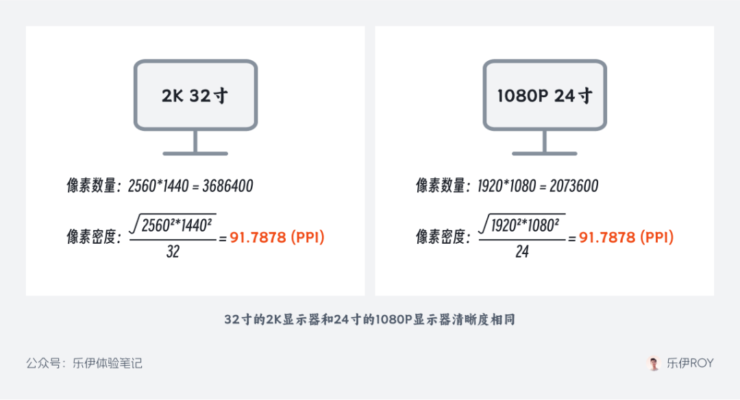 通过下面这个案例我们也可以看出,32 寸 2K 显示器和 24 寸 1080P 显示器的 PPI 完全相同,也就是两者的清晰度是完全一样的,并非我们平时理解的 2K 显示器一定比 1080P 清晰。(K 级针对的是横向分辨率,P 级针对的是纵向分辨率)