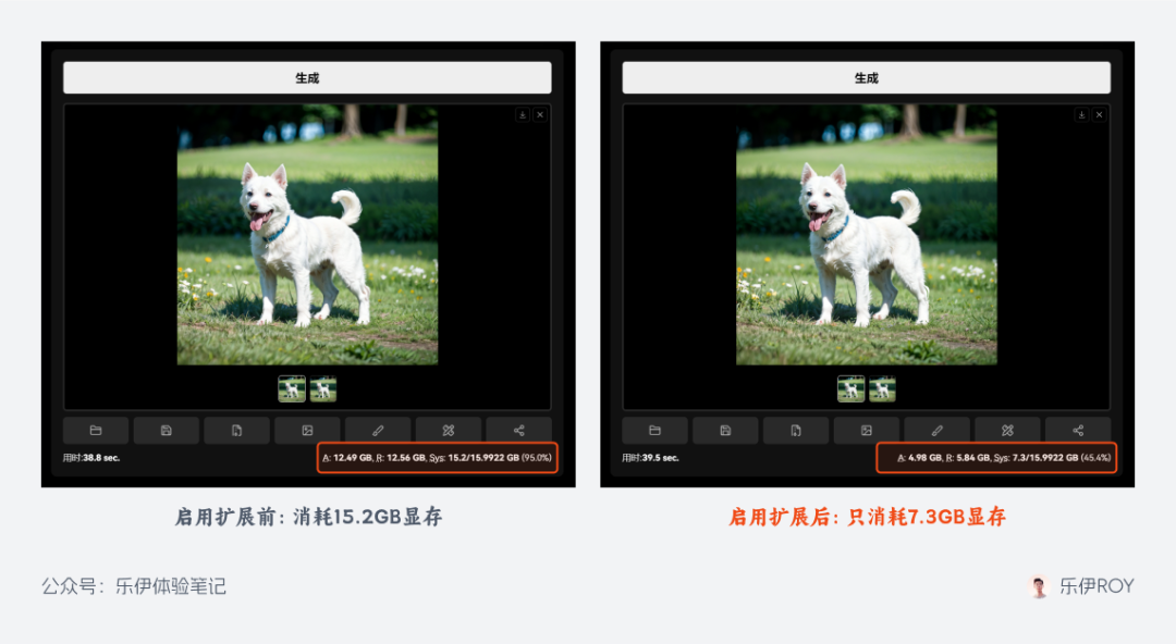 具体效果可以看下图,同样是将 512 分辨率的图像放大 4 倍到 2048.开启 Multi Diffusion 后虽然运行时间差不多,但肉眼可见的是显存占用下降了一半之多,而实际的图像效果却基本一致,简直完美。