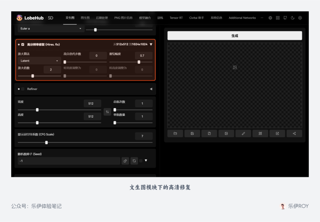 在 SD WebUI 的文生图模块,内置了 Hires-Fix 高清修复功能,这就是平时我们平时最常使用的高清放大功能了。