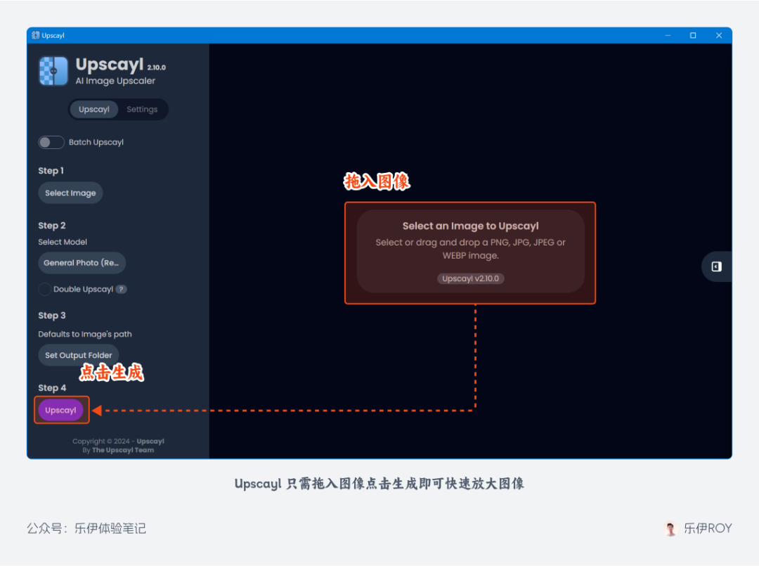 使用 Upscayl 方法非常简单,我们从 Upscayl 官网或官方 Github 页面下载程序后进行本地安装。安装完成后打开 Upscayl,在其中拖入需要放大的图像,直接点击执行放大按钮,即可生成一张放大 4 倍的图像。