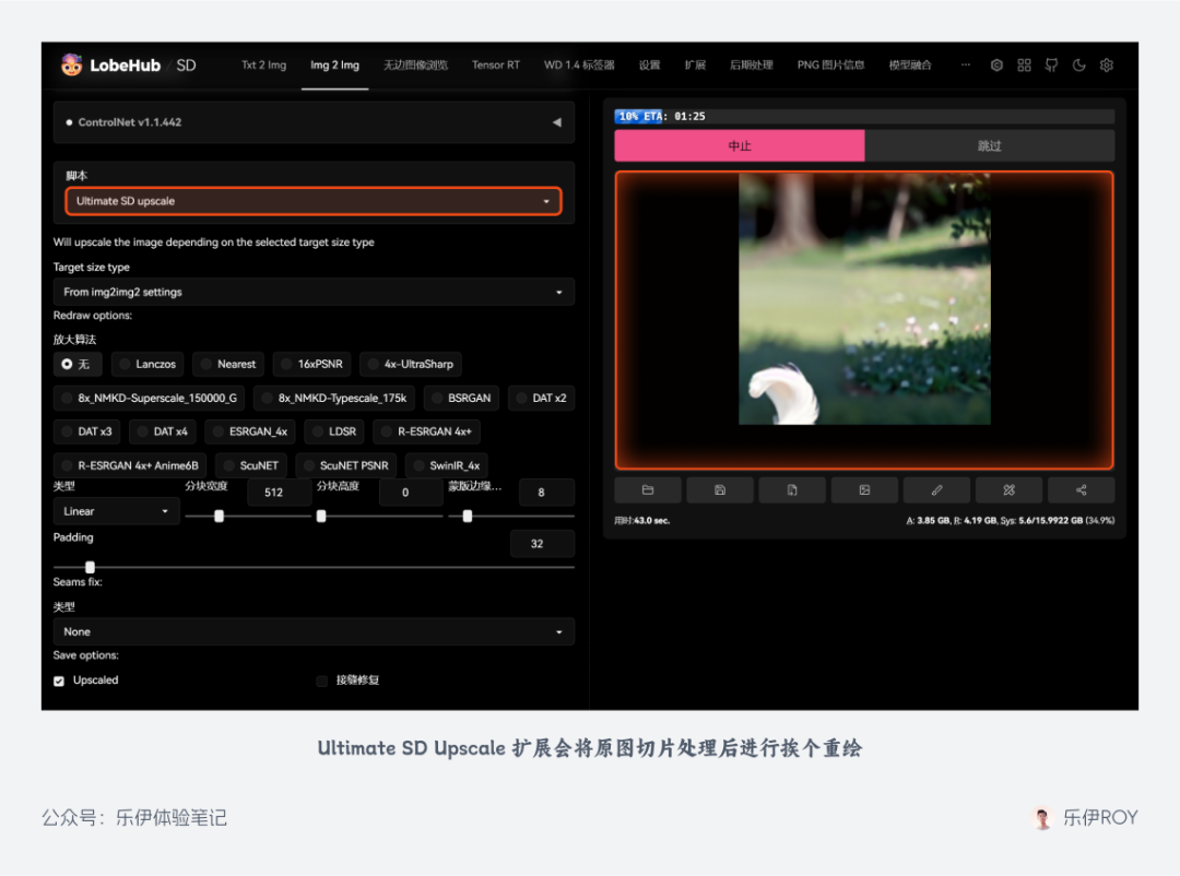 我们先来看看第一款插件 Ultimate SD Upscale。在前面 SD WebUI 原生的高清放大操作中,我们是直接将原图丢给模型进行完整的重绘,但是受限于显卡的算力,我们支持重绘的图像尺寸往往都比较小。那有没有方法可以在不升级硬件的情况下绘制更大尺寸的图像呢?