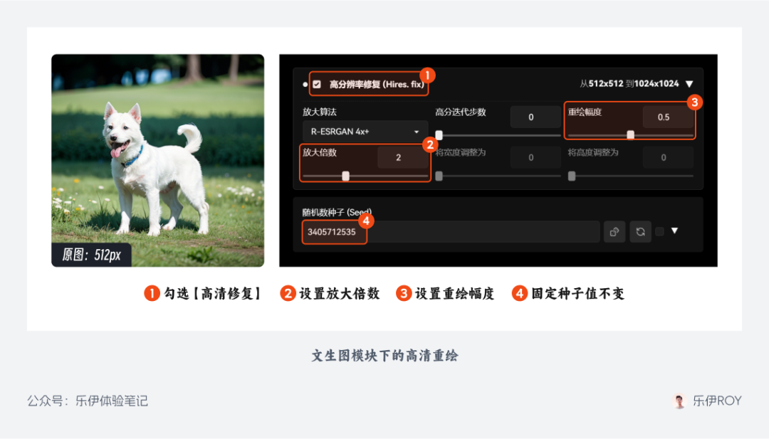 高清修复的原理很简单:本质上是在原图基础上进行了一次额外的图生图重绘。操作方法也很简单,我们以 512 分辨率的图像为例,先在文生图中生成一张所需的图像,当图像内容比较满意时,我们将对应图像的种子值固定。接着勾选高清修复选项,将图像放大倍数设置为原图的 2 倍,重绘后的图像尺寸即为 512*2=1024px。