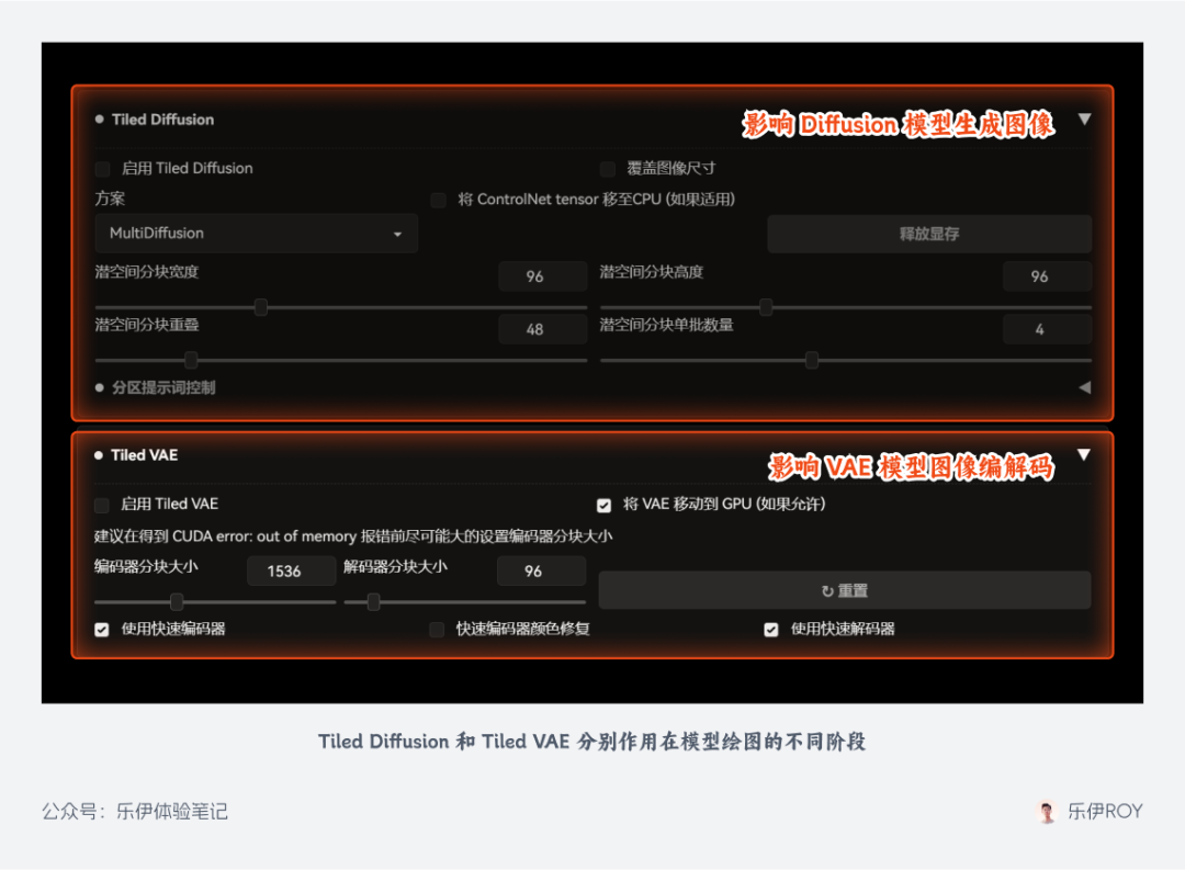 严格来说,Multi Diffusion 是由 Tiled Diffusion 和 Tiled VAE 两款插件组合而成的。Tiled Diffusion 生效在 Diffusion 扩散模型运作过程,而 Tiled VAE 作用在 VAE 模型图像编解码过程,在实际使用时需要同时开启 2 个扩展,配合使用体验更佳。