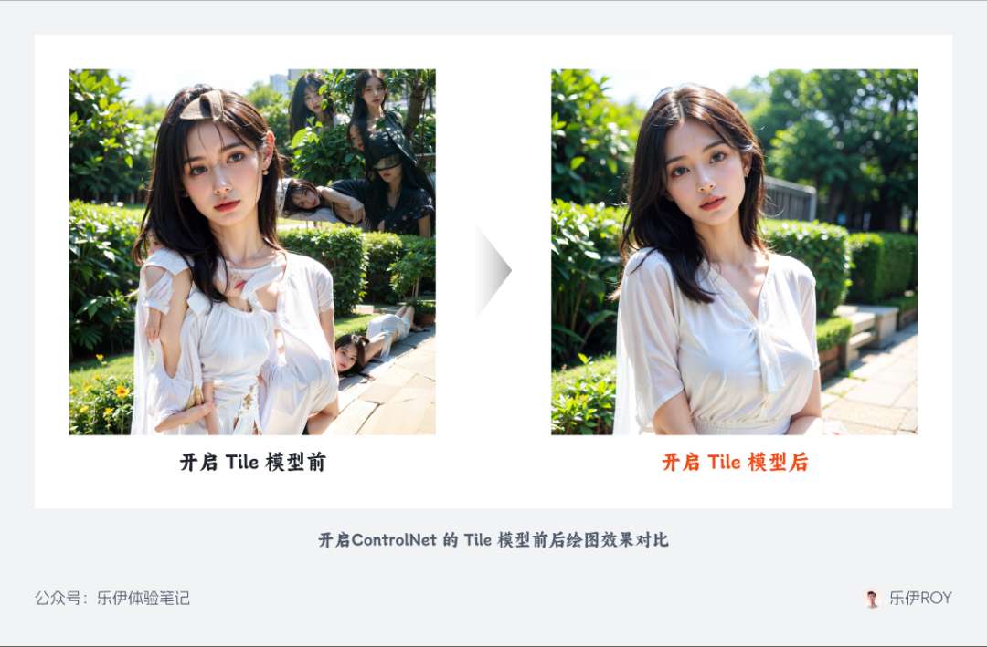 通过这种方式,我们在绘制图像时启用 Tile 模型,便可主动识别每张切片中的语义信息,减少全局提示的影响,也因此 ControlNet Tile 被广泛用于图像细节修复和高清放大等场景,可以说和切片重绘的处理方式是天作之合。