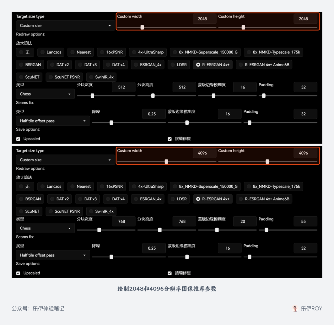当然如果大家觉得参数理解起来非常麻烦,下面也给大家提供了分别绘制 2048 和 4086 分辨率图像的推荐参数,在绘制对应尺寸图像时直接设置成同样的数值即可。