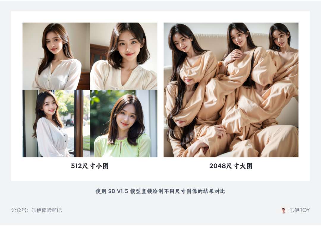 实际影响出图尺寸的是模型训练时采用的图像数据集。对 SD 的 V1.5 版本的绘图模型而言,通常我们的图像分辨率都是设置在 512~768 范围内,这是因为在训练模型时使用的数据集图像也是使用的这个尺寸,如果图像尺寸设置超过这个范围,模型往往会将绘图指令理解为多张小图拼合的结果,因而出图结果中会出现多人或多肢体的情况,就像下图一样。