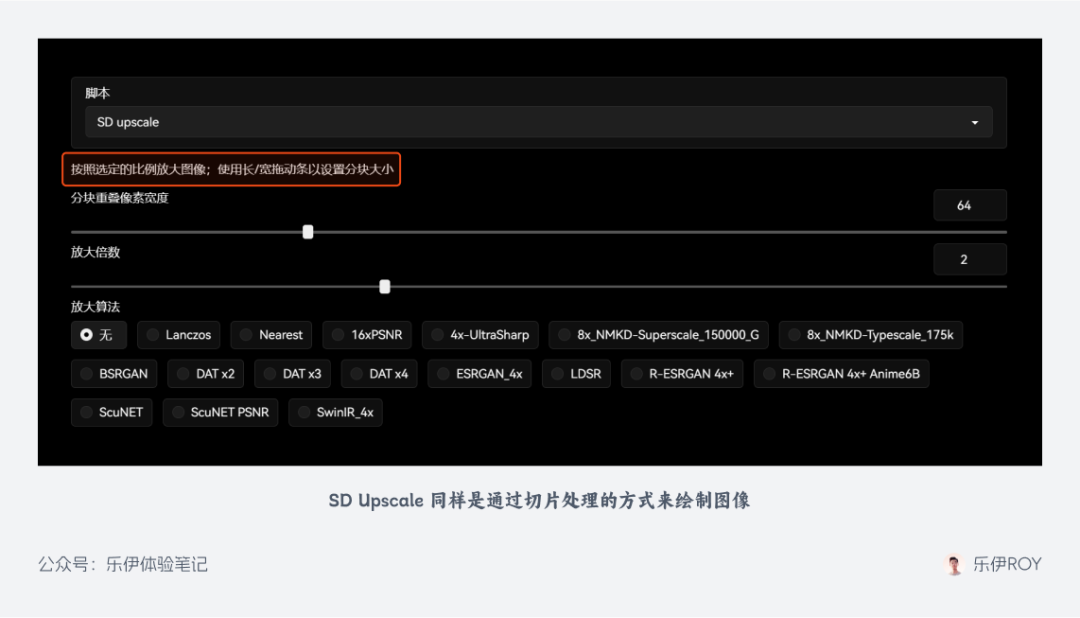 除了 Ultimate SD Upscale 外,我们有时候还会看到 SD Upscale 等其他辅助放大图像的脚本插件,它们大多也都是采用切片重绘的操作过程,但相较之下其他插件功能单一且支持设置的参数项更少,所以建议大家只需下载 Ultimate SD Upscale 这一款功能齐全的扩展插件即可。