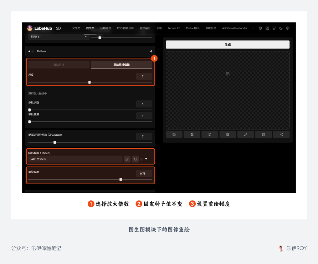 除了文生图模块,使用图生图进行重绘也是同样的原理,实际操作上我们只需将原图发送至图生图模块,固定种子值并设置图像尺寸后点击生成即可。