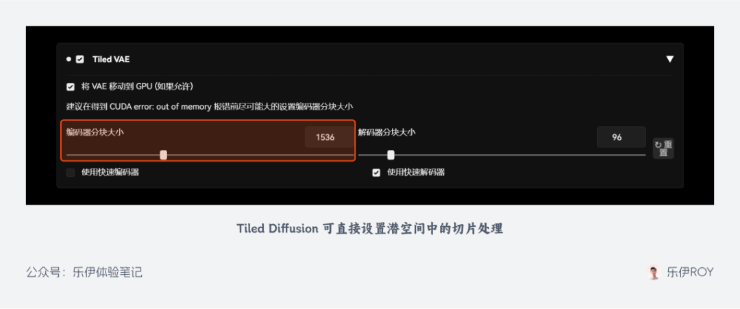 由于对显存影响主要是未降维前的切片大小,因此如果你在图像生成后有提示【CUDA error: out of memory】即显存不足的报错,可以适当降低编码器切片大小 Encoder Tile Size的数值。