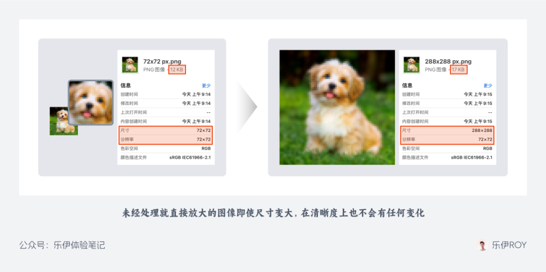 举个最简单的例子,我们将一张原本 72x72 尺寸的图像放大到原有尺寸的 4 倍再导出,即使图像尺寸变大,文件大小也增大了,但实际的清晰度并没有任何改变,其原理在于放大过程中并没有增加有用的像素信息,图像细节并没有变化。这个过程就像一块蛋糕从 4 块切成了 16 块,虽然看似蛋糕数量增多了,但本质上蛋糕的实际体积并没有发生变化。