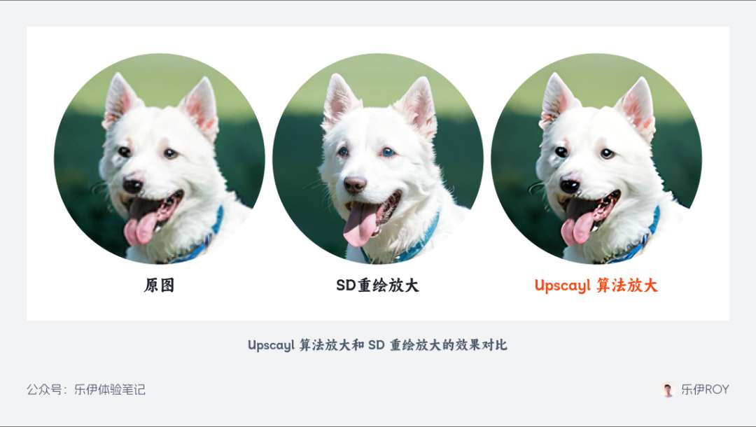 这里的放大算法有很多,我们使用针对写实图片的R-ESRGAN4x+算法,将重绘幅度设置为 0.5 并点击生成,即可获取一张被放大 2 倍的图像,相较之下放大后的图像拥有更多细节,画质清晰度得到了明显提升。