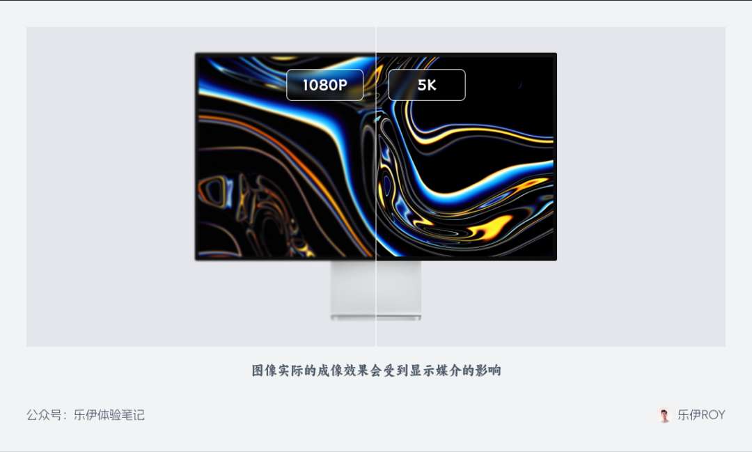 那么图像分辨率大,我们看到的图像就一定足够清晰吗?这也不一定,因为图像实际的成像效果还受到显示媒介的影响,比如一张高分辨率的图片在 1080P 屏和 5K 屏上看到的效果是完全不同的,那这里的显示器分辨率和图像分辨率是什么关系呢?