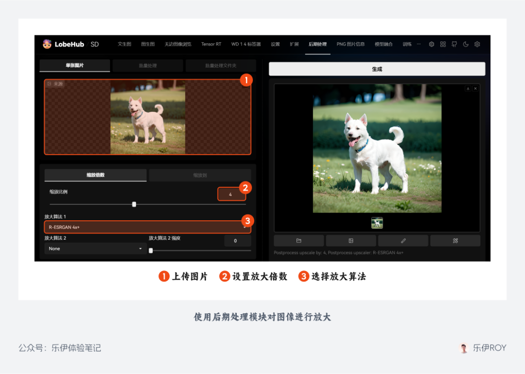 要使用后期处理功能非常简单,只需将需要放大的图像进行上传,选择好放大算法和放大倍数点击生成即可。