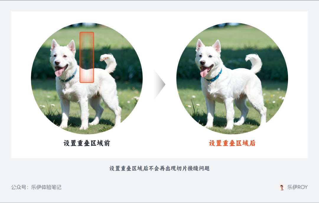 下图中分别是设置了重叠区域和未设置时的绘图对比,可以发现在未设置重叠区域的情况下,切片之间会有明显的切缝,而设置了重叠区域后切片间融合效果好得多。需要注意的是,重叠区域的宽度通常设置为切片宽度的 1/3~1/2 即可,过大的重叠区域绘制会浪费算力,显著降低运行速度。