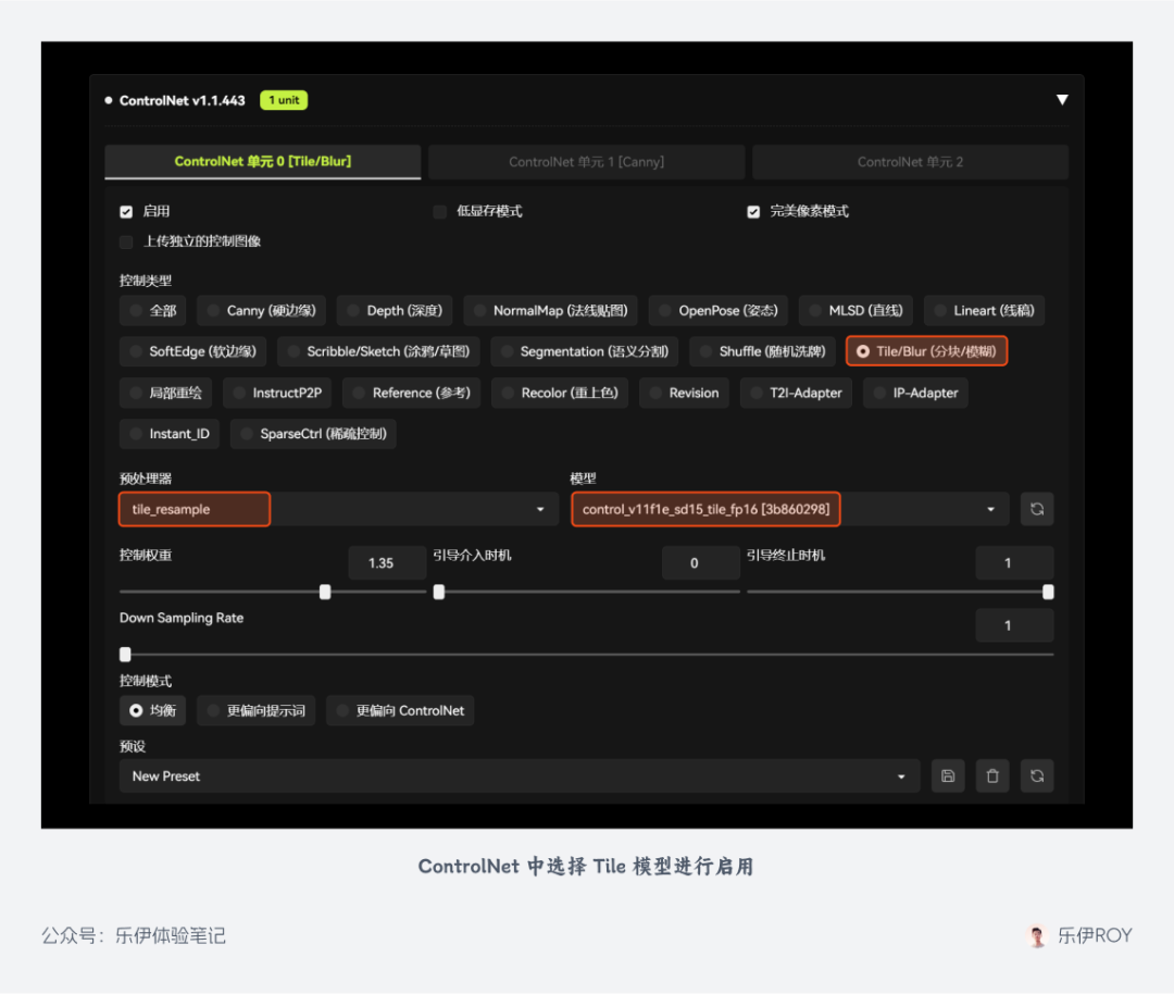 关于 ControlNet 中的 Tile 模型在之前的 ControlNet 教程中已经做过介绍,需要安装和学习的朋友可以翻看之前的文章进行查阅。
