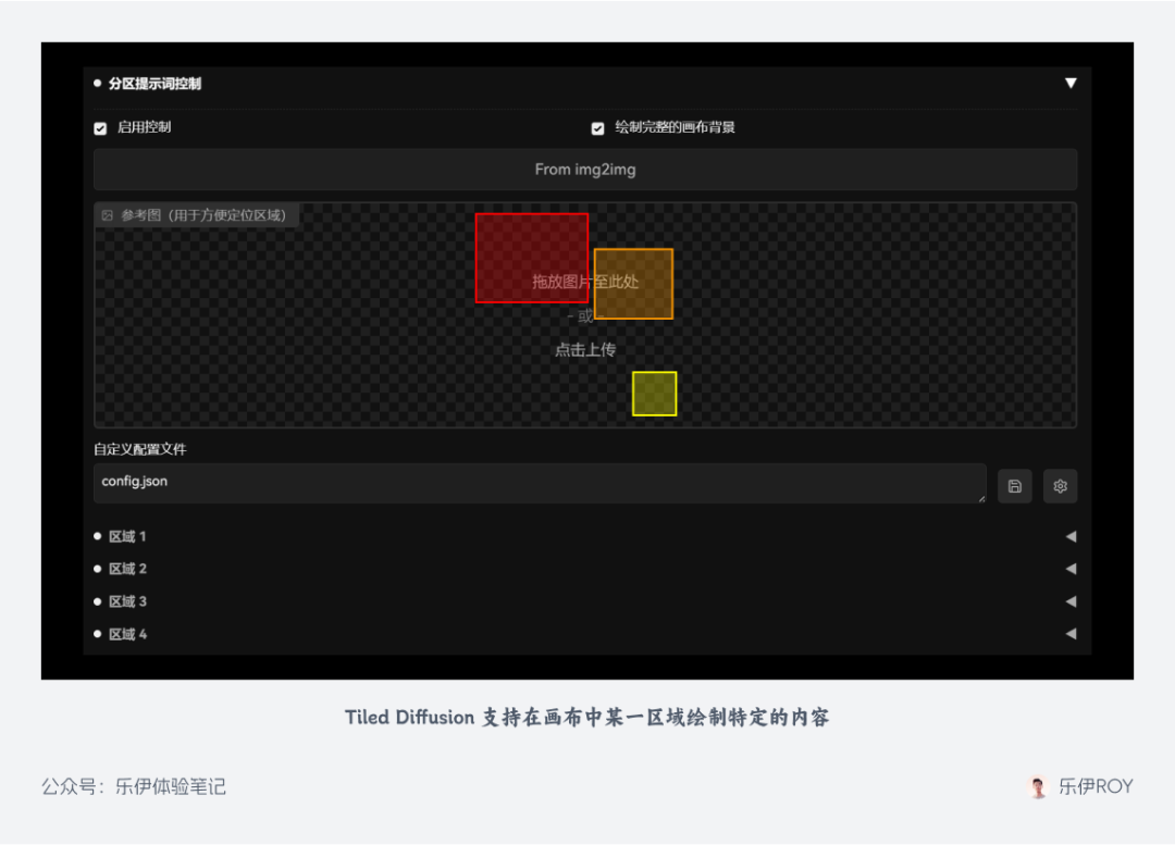 在 Tiled Diffusion 下面还有一块分区提示词参数,该功能可以在同一画布中针对不同区域设置不同提示词,实现分区控制的效果。该功能其实有点类似 PS 的创意生成功能,但缺点是选区不够灵活,后续我会通过其他教程介绍更合适的操作方法,此处先按下不表。