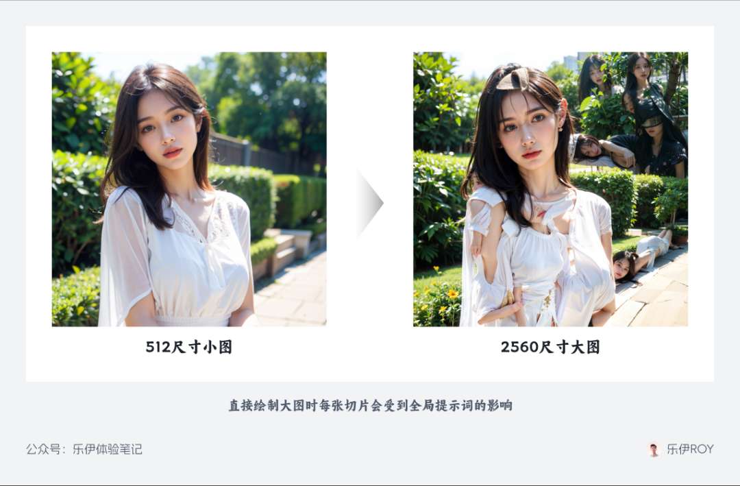 除了硬件方面的显存要求,另一个让大家很头疼的就是重绘时切片内容问题,简单来说就是切割后的每张切片图在重绘时都会收到全局提示词的影响。举个例子,我们的全局提示词是“女孩”,当我们绘制大尺寸图像时,原图被分割为多张切片,我们希望的是每个切片重绘各自原有的内容,但实际上每张切片都会被识别成一张独立的图片,导致每个块中可能都会理解成单独绘制一个女孩,出现如下图所示变形的结果。